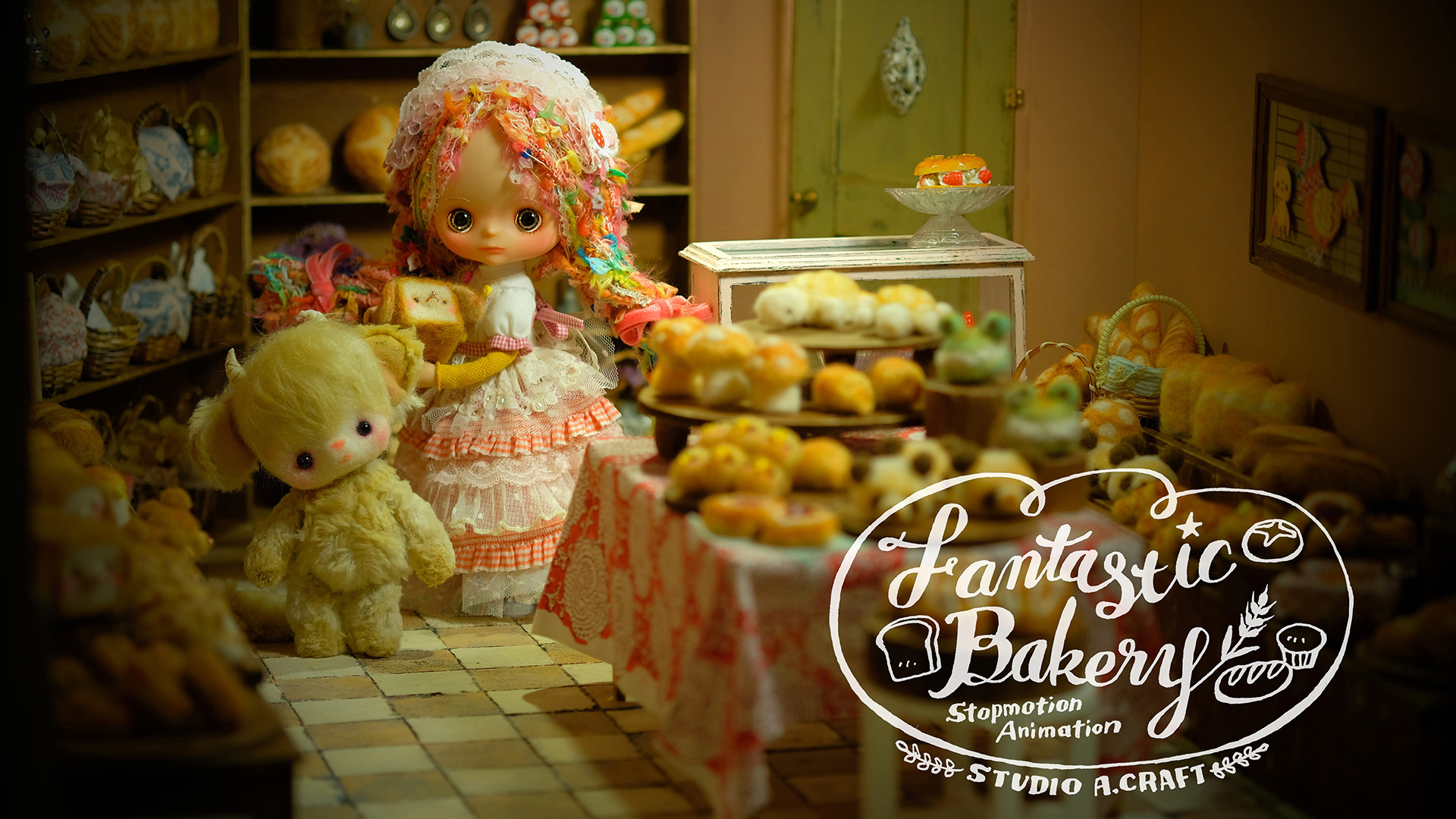 魔法使いの少女、マフィンの可愛いパンがたくさん並ぶベーカリー。